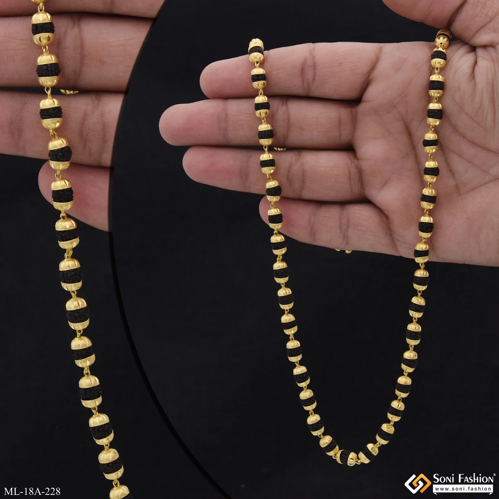 This vintage-inspired Rudraksha mala combines textured black beads with a glamorous V-cut design in miligram gold, offering a distinctive religious accessory for men. Handmade with brass and 1 gram of gold plating, this golden mala blends tradition with style, making it perfect for daily wear or spiritual occasions. The carefully crafted beads ensure durability and a comfortable fit, adding a meaningful touch to your look.
