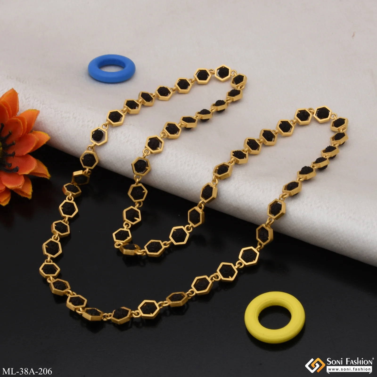 Elevate your spiritual style with this 1 Gram Gold Forming Streamlined Mala designed for men. Crafted with high-quality rudraksha beads, accented by miligram gold detailing on brass, this golden mala offers a unique blend of religious significance and elegant Rajwadi craftsmanship. The textured black beads create a striking contrast, making it perfect for daily wear or special occasions. Durable and lightweight, this superior quality mala enhances both your spiritual energy and fashion statement.