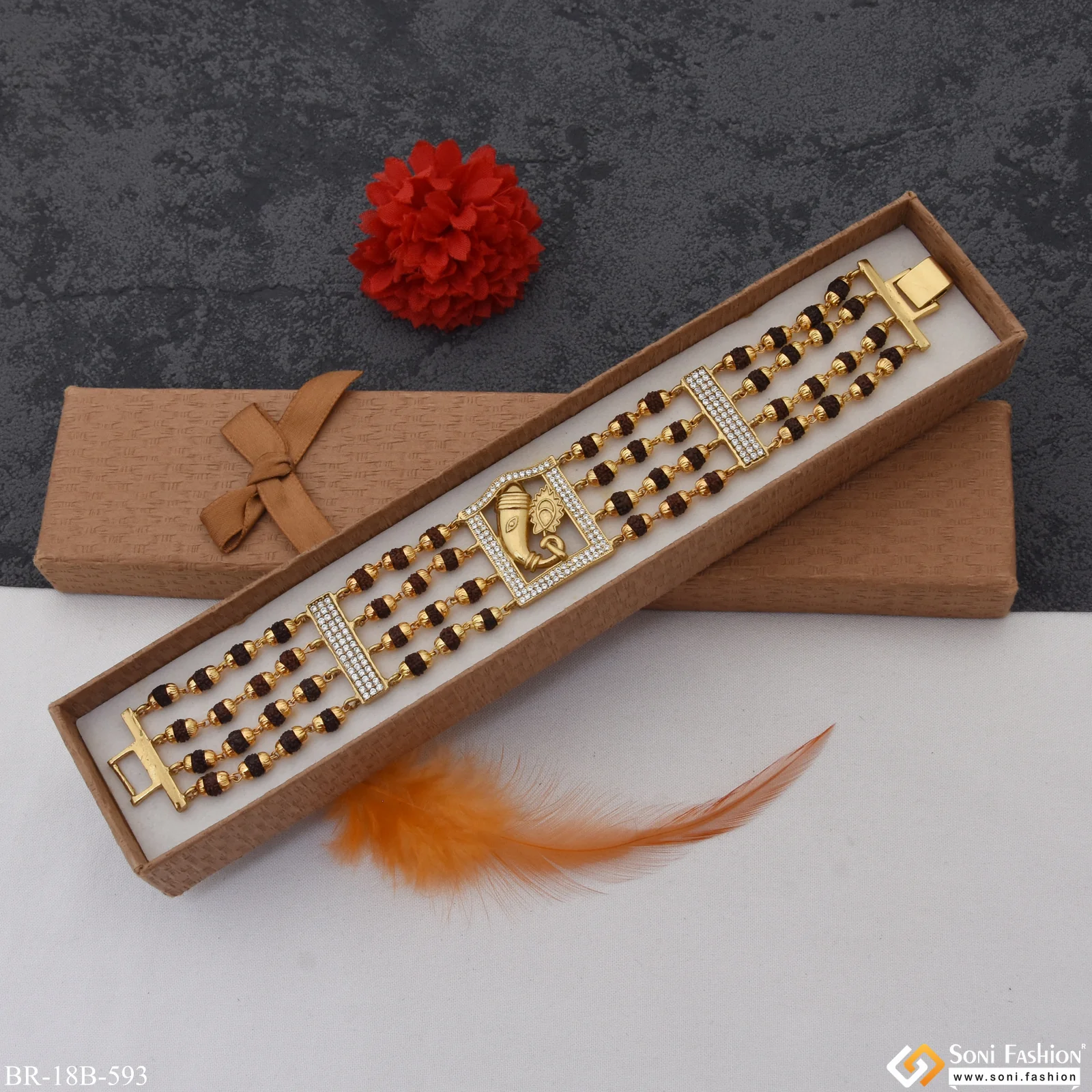 Enhance your style with our Ganpati with Diamond Best Quality Elegant Design Gold Plated Bracelet. This textured bracelet features a Rudraksha bead and a Ganpati/Ganesha charm, making it a religious and trendy accessory. Made of brass and plated with gold, it is durable and elegant. Add some sparkle with our beautiful diamond and Hip Hop design.