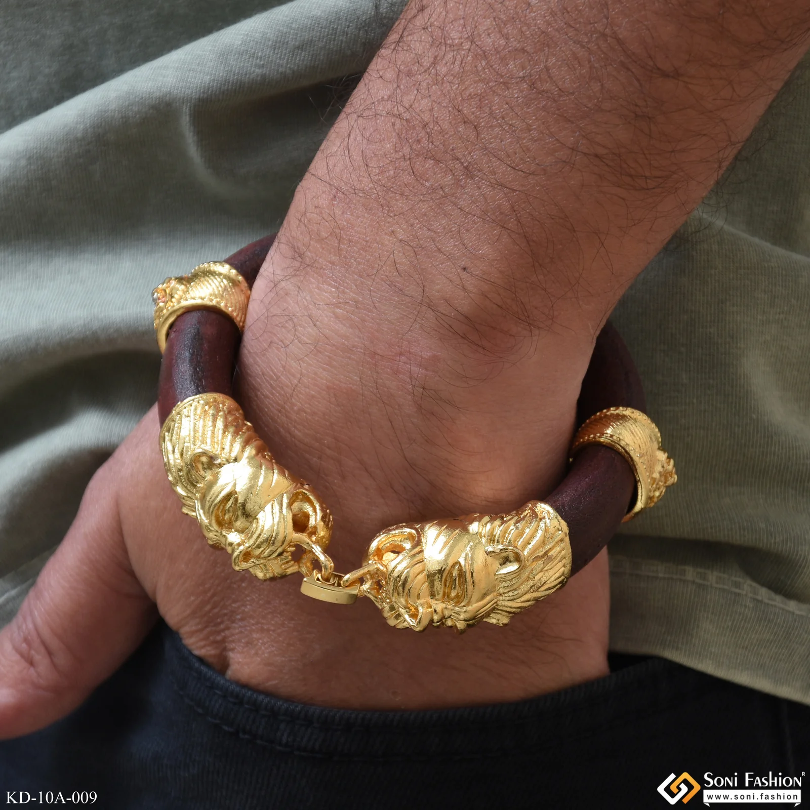 This men's Lion Face kada is crafted from textured, shining, and royal-style brown leather with a gold-plated finish. Its round and Rajwadi design features an Om symbol as well as a lion head. The leather bracelet features Hid_Reg_Plating and is a classic Genda Kada style. Making a lasting impression, this golden kada is perfect for any occasion.