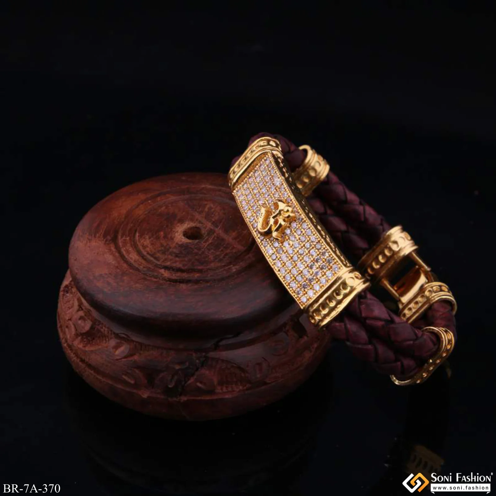 Om Logo On Leather With Diamonds Superior Quality Gold Plated Bracelet - Style A370