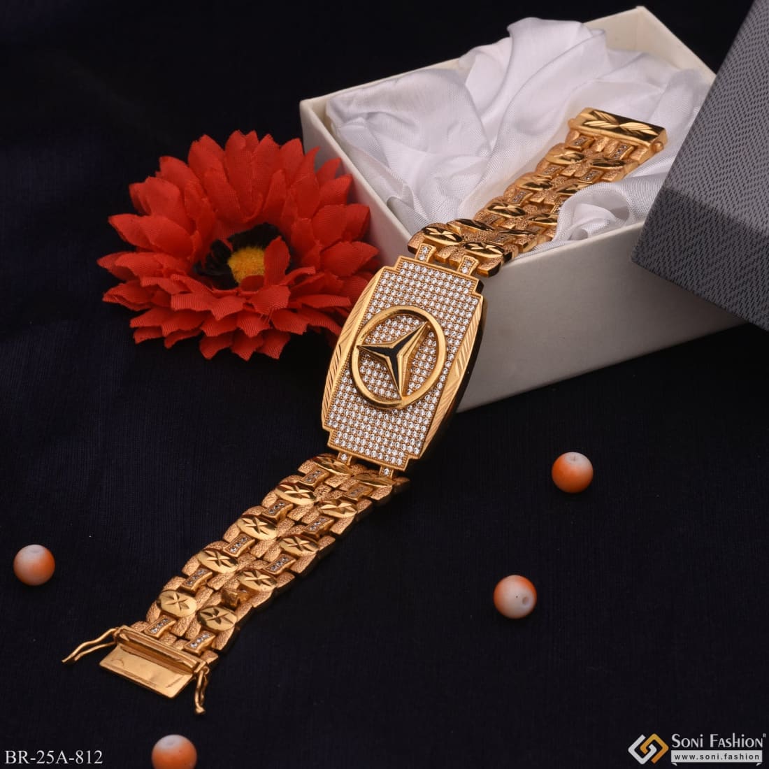 Introducing Triangle Logo Glossy With Diamonds Attaractive Background Bracelet, a vintage, textured, and handmade bracelet with a square shape featuring a shining royal rhodium plating, rectangular matt finish, and hip-hop design. Made of brass and rhodium with a golden bracelet and bedazzled with diamonds, this accessory is perfect for the groom with a sophisticated style.