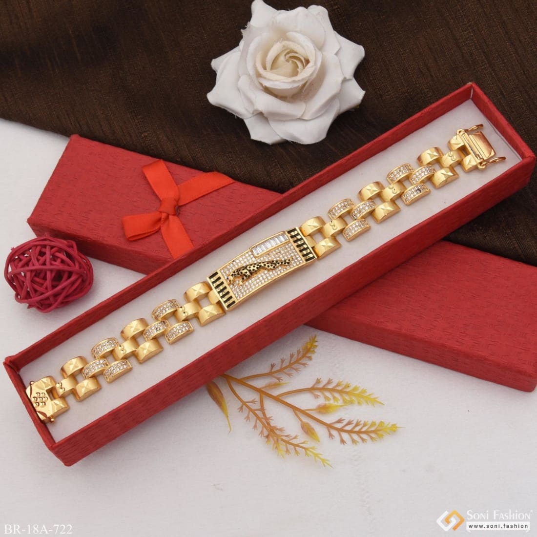 This Very Best Jaguar Bracelet With Diamonds For Men - Style A722 is the perfect mix of luxury and style. Featuring a textured, shining, and royal Rajwadi design, this oval and matt bracelet is limited edition and boasts a hip hop, golden brass, and diamond look. This high-end bracelet has a special Hid_Reg_Plating plus a black bracelet finish.